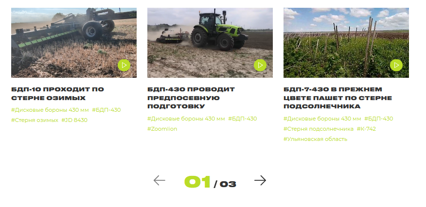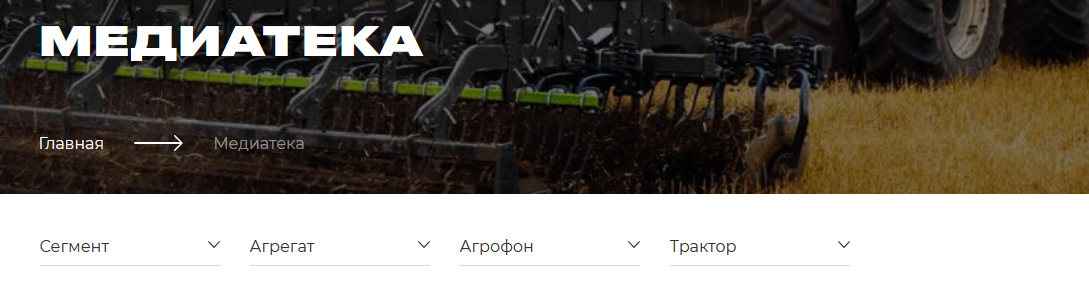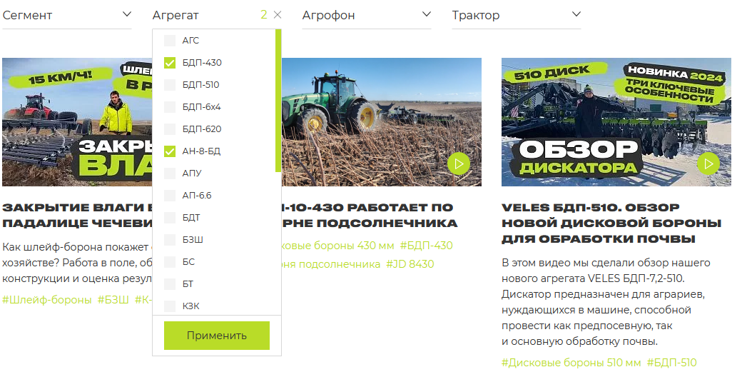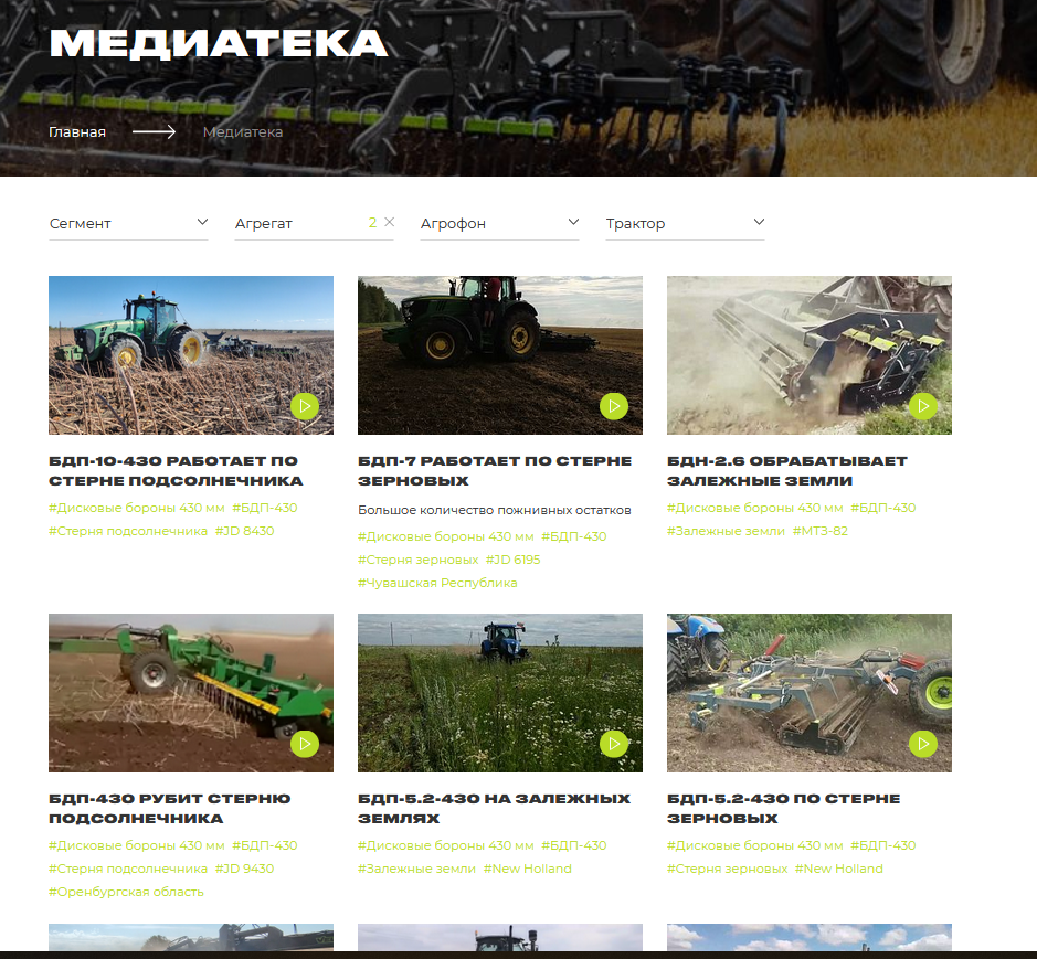 Страница содержит в себе фильтры, которые помогут найти ролики с интересующими вас орудиями: вы можете выбрать сегмент орудий, агрегат, агрофон или трактор, с которым работало орудие.